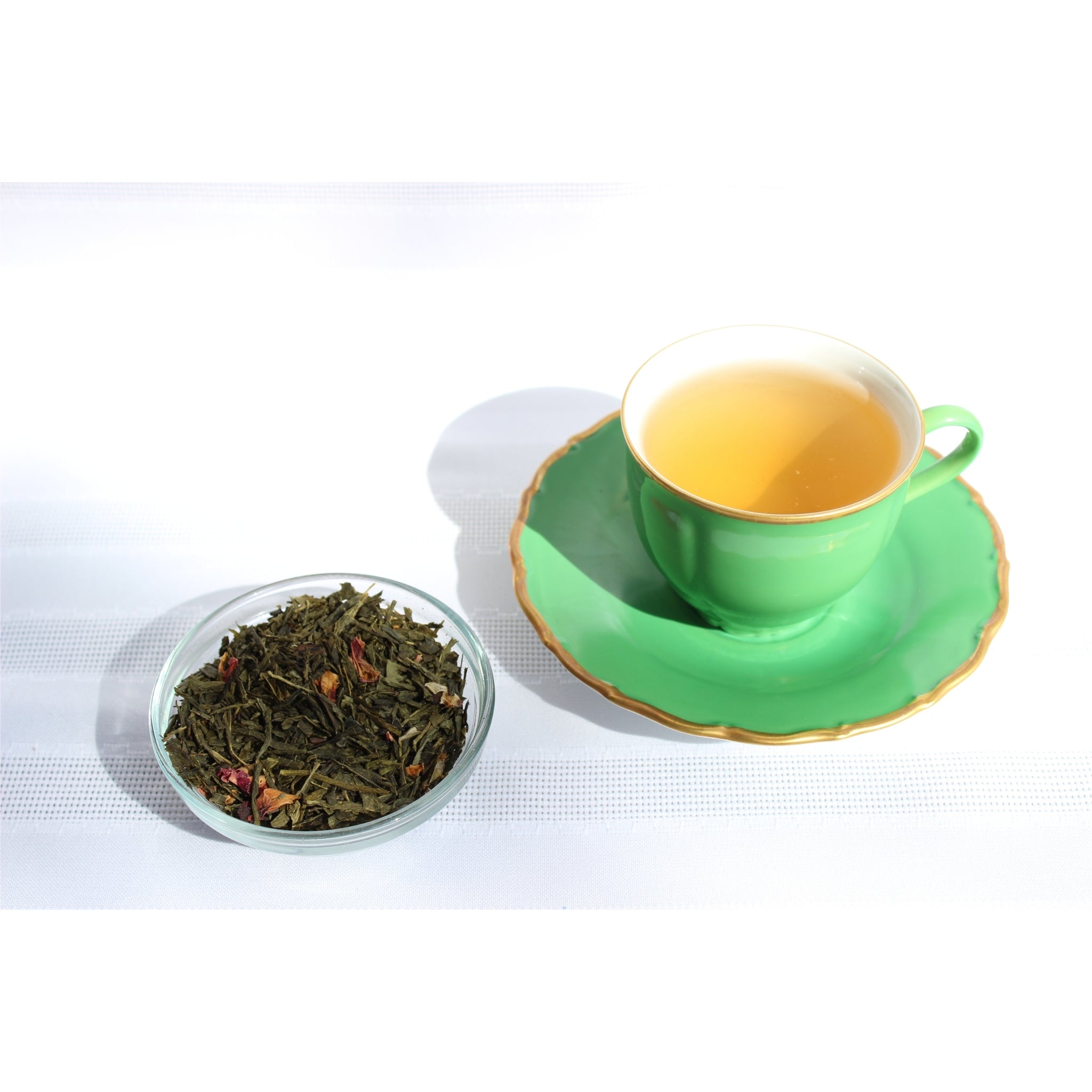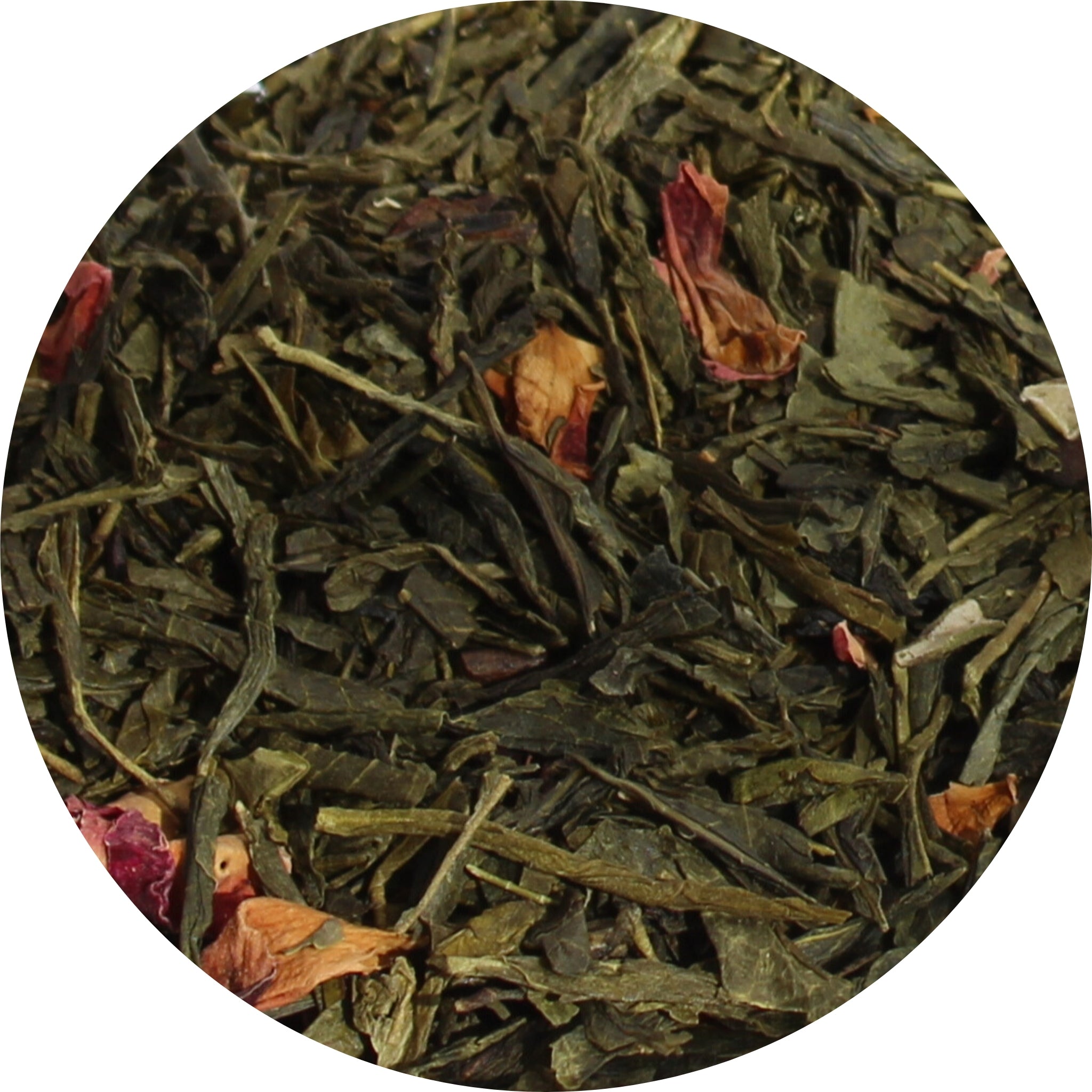 Sencha Green Tea, Pink Rose Petals, Artificial Pomegranate Flavor.